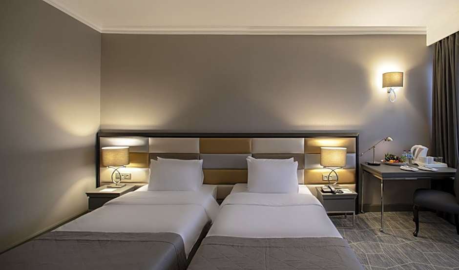 Located on the 8th floor, this connection room ranges between 197 ft² and 213 ft² and features Taksim Square and city view. Decorated in a simple style with warm earthy colors, it offers two bedrooms connected by a door and two bathrooms with a shower.